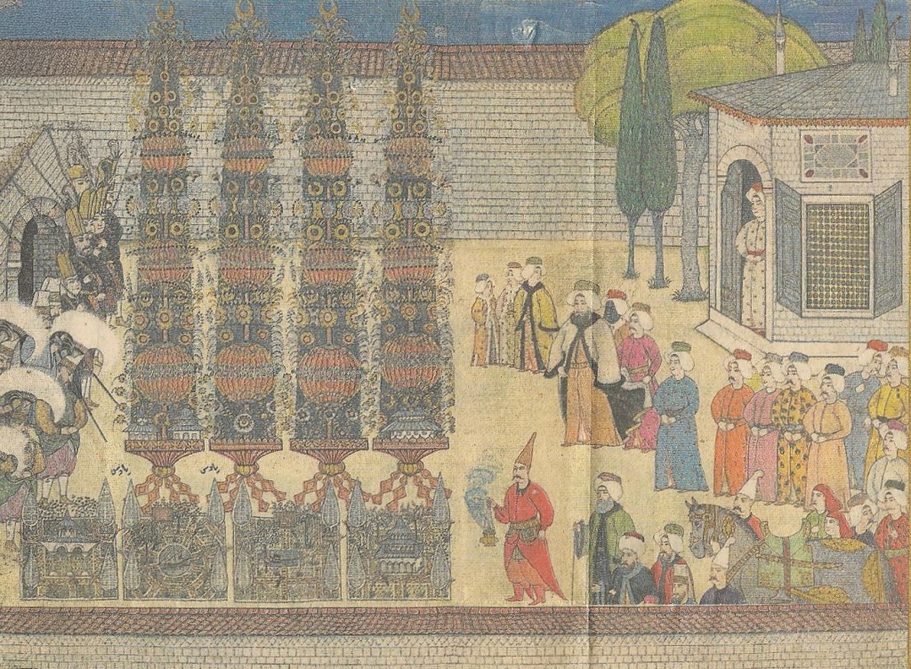 Sünnet olan şehzadeler için hazırlanmış büyük nahıllar ve eski saray avlusunda sultanı karşılamak için bekleyen kalabalık (nakkaş Levni, Surname-i Vehbi 1720)