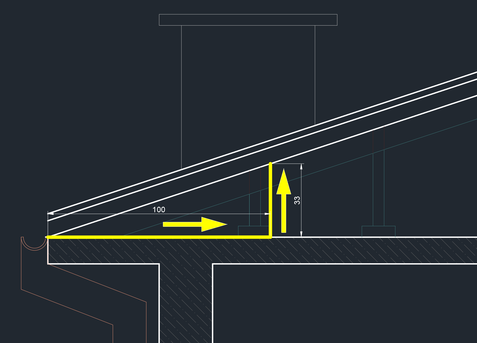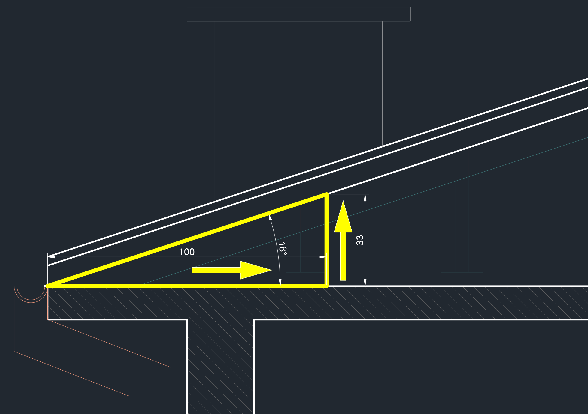 Saçaktan içeri doğru 1 metre ( 100 cm ) girilir ve eğim % 30 ise 30 cm, % 33 ise 33 cm yukarı doğru bir çizgi çizilir. Gelinen nokta ile başlanılan nokta birleştirilirse yatay bir dik üçgen elde edilir ve iki uzun kenar arası açı ölçülerek açı hesaplanır.